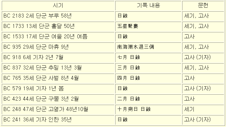 다만 중국의 사서에 나타난 최초의 일식 기록이 주나라 때인 BC 776년인데 비해, 우리의 경우는 제2세 부루단제 때인 BC 2183년 일식이 있었던 것으로 기록돼 있어 중국 기록보다 적어도