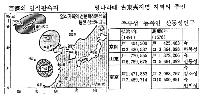인구 및 호수면에서 백제는 중국대륙에 있었으며 한반도에는 그 일부가 존재했다고 하는 사서의 내용과 천문 및 기상학적 입증이