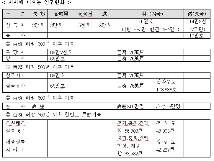 기록되어 있으나 조선때의 戶當평균가족수를 고려할때 百濟의 인구를 최소 311만명으로 볼 수 있다.
