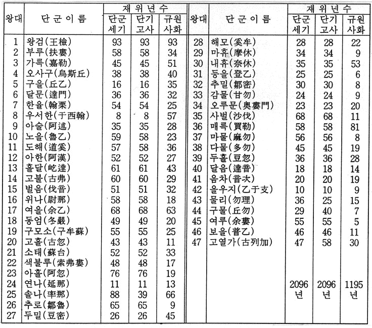 < 단군조선의 사서별 제왕 역대표 >