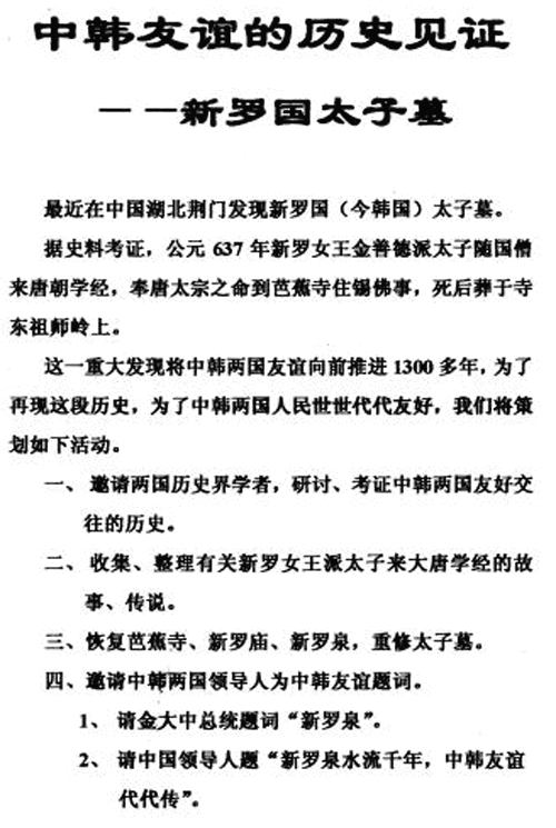 최근 중국의 호북성 형문(荊門)에서 신라 선덕여왕의 태자묘로 추정되는 고분이 발견되었다.