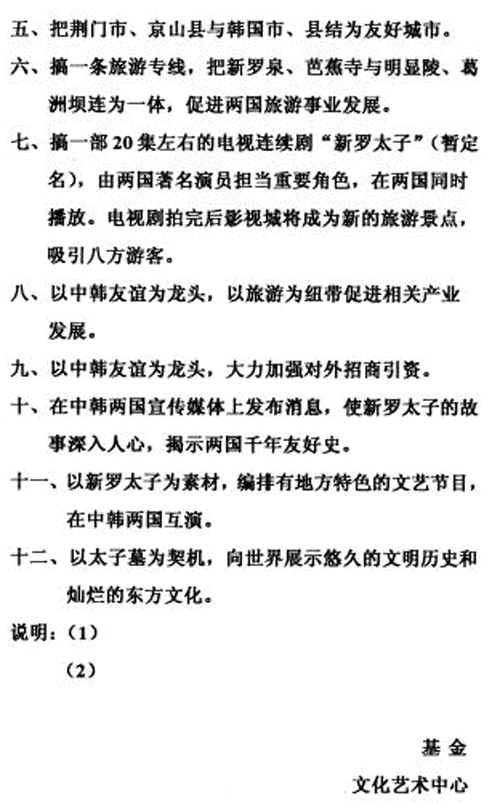 7. 양국의 유명배우가 출연하는 20부작 TV연속극 "신라태자"(가칭)를 만들어 양국에서 동시에 방영한다. 추후 촬영지는 관광지로