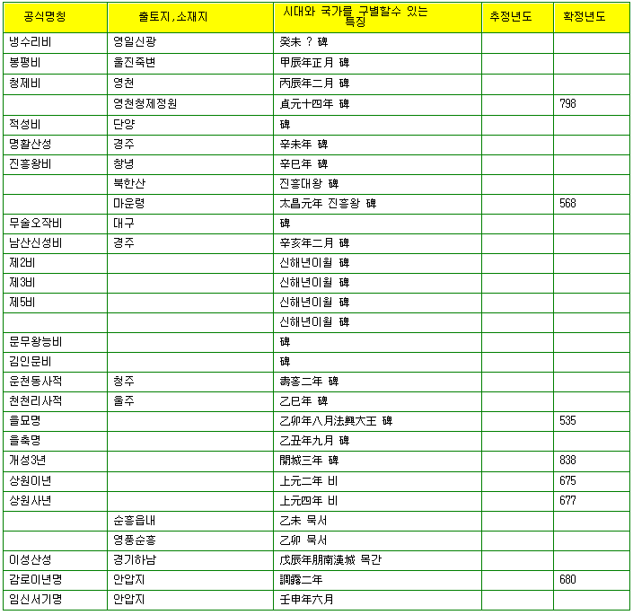비석으로 보면 분명한 年代를 알수 있는 것은 535, 568, 675, 677,,680, 798, 858 년이다.