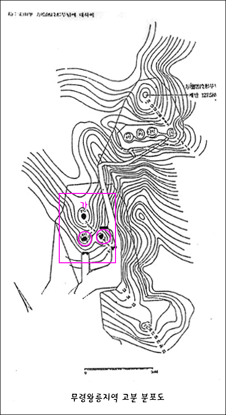 ☞ 검은점 위 가는 사마왕릉이고 그 전면 약 20미터에 두 개의 묘가 나란이 위치해